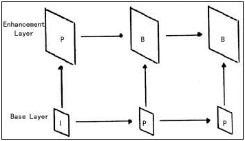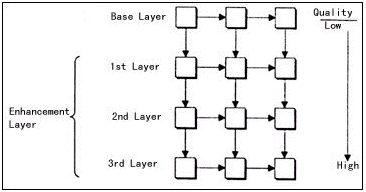 關于分層可擴展性編碼的研究可以追溯到10年前,目前它已經(jīng)被許多現(xiàn)行的國際壓縮標準接納,例如H.263+和MPEG-4。分層可擴展編碼主要有三種:時域可擴展性、空域可擴展性和質(zhì)量可擴展性。其中質(zhì)量可擴展性也稱為PSNR可擴展性,原因是視頻質(zhì)量通常用峰值信噪比(PSNR)來衡量。