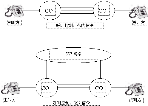 在任一個(gè)電話系統(tǒng)中,都要規(guī)定一些固定的信令機(jī)制來實(shí)現(xiàn)呼叫的建立和釋放。最初,象POTS(普通舊電話業(yè)務(wù))那樣的電話系統(tǒng)都是用帶內(nèi)信令來傳遞信息。帶內(nèi)信令是指信號(hào)的頻率在話音頻率范圍之內(nèi)(0.3~3.4kHz),比如:DTMF信號(hào)就屬于帶內(nèi)信號(hào)。帶內(nèi)信號(hào)是在話音通道內(nèi)傳遞的。相反,SS7使用一個(gè)完全獨(dú)立于話音網(wǎng)的數(shù)據(jù)網(wǎng)來傳遞信令,這樣可以大大提高電話網(wǎng)絡(luò)的利用率。比如,在呼叫發(fā)起但未建立完成之前,不需要分配話音電路,這使得傳遞的信令數(shù)據(jù)只和呼叫有關(guān)而和電路無關(guān),為在交換機(jī)之間、交換機(jī)和其它網(wǎng)絡(luò)之間高效、可靠地傳遞信息提供了可能。同時(shí)也支持更高級(jí)的應(yīng)用,如:主叫識(shí)別、無線漫游和800號(hào)業(yè)務(wù)。如下圖1,顯示出了帶內(nèi)信令和SS7在呼叫接續(xù)上的區(qū)別。