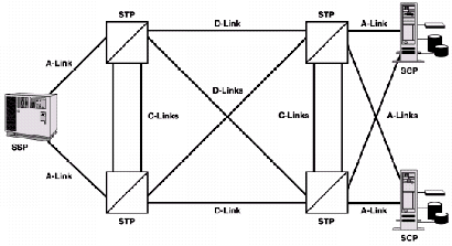 SS7提供消息傳遞以實(shí)現(xiàn)正確無誤的業(yè)務(wù)功能,如呼叫建立。因此,SS7被設(shè)計(jì)成能達(dá)到相當(dāng)高的可靠性?煽啃詠碜枣溌返亩鄻有院腿哂鄠浞。圖4說明了一個(gè)簡(jiǎn)單SS7網(wǎng)絡(luò)的標(biāo)準(zhǔn)例子,著重說明了一些內(nèi)建的可靠性特征,比如鏈路的網(wǎng)狀配置,這樣使得網(wǎng)絡(luò)中的每個(gè)信令點(diǎn)間都有冗余備份的鏈路,從而提高了整個(gè)網(wǎng)絡(luò)的可靠性。