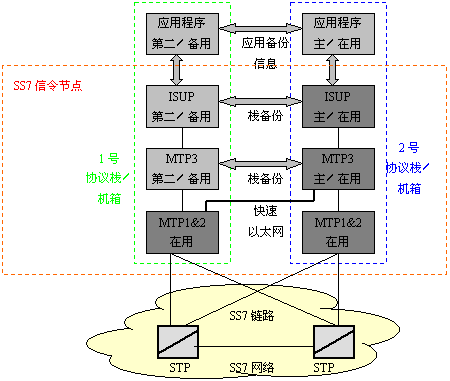 只有SS7鏈路出現(xiàn)故障時(shí),SS7協(xié)議才有相應(yīng)的規(guī)則去處理故障,對(duì)其它故障的處理必須在設(shè)計(jì)SS7平臺(tái)和整個(gè)系統(tǒng)結(jié)構(gòu)時(shí)予以考慮。還有一個(gè)普遍的要求是:軟件的升級(jí)過程中不能影響整個(gè)系統(tǒng)的運(yùn)行。能達(dá)到以上要求的一個(gè)解決方案是:使用兩個(gè)主機(jī)箱,在每個(gè)主機(jī)箱里插有SS7接口板,用于支持一條或多條SS7鏈路。讓兩個(gè)主機(jī)都使用一個(gè)SS7地址,也就是共用一個(gè)信令點(diǎn)編碼,這樣遠(yuǎn)端的交換機(jī)或STP就會(huì)認(rèn)為這兩個(gè)主機(jī)是一個(gè)完整的系統(tǒng)。這樣,這兩個(gè)主機(jī)組成的系統(tǒng)就能在其中一個(gè)出現(xiàn)故障時(shí)仍能正常工作。