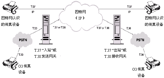 在T.37術(shù)語中,因特網(wǎng)傳真(Ifax)設(shè)備能夠通過一個(gè)出站設(shè)備向傳統(tǒng)連接到PSTN的傳真機(jī)發(fā)傳真,或者通過一個(gè)IP網(wǎng)直接發(fā)送到另一個(gè)因特網(wǎng)傳真(Ifax)設(shè)備。