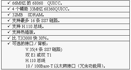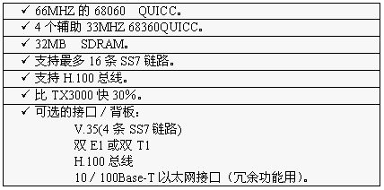 TX3000卡的功能大致和TX2000卡相同,但它比TX2000的性能2.5至5倍。TX3000卡上有一個(gè)66MHZ的68060協(xié)處理器。TX3000卡為SS7應(yīng)用配置1至4個(gè)QUICC通信控制器,最多16條信令鏈路,提供一個(gè)三口V.35,擁有雙T1或雙E1接口。(主板上標(biāo)準(zhǔn)配置一個(gè)QUICC,支持四條SS7鏈路,當(dāng)CT總線和串行接口都要使用,或者處理的鏈路超過(guò)4條時(shí),可先配置有三個(gè)QUICC的背板,四個(gè)QUICC可支持16條SS7鏈路)。