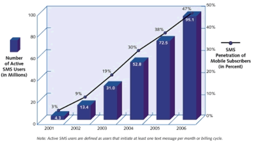 用戶到用戶的文本消息被使用了接近10年,用戶使用SMS來投票一個喜歡的運動明星,雇出租車,訂購劇場的票. 同時,
