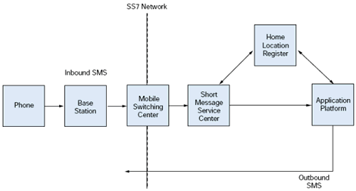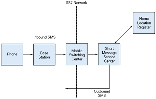 從MSC, SMS消息在SS7網(wǎng)絡中發(fā)送到短消息中心(SMSC), 一個網(wǎng)絡的標準部分. SMSC向Home Location