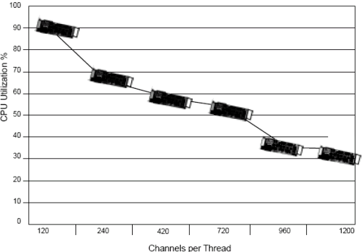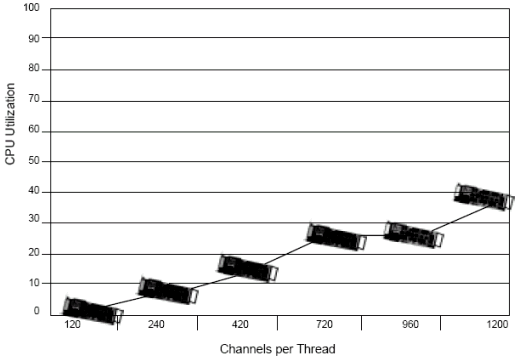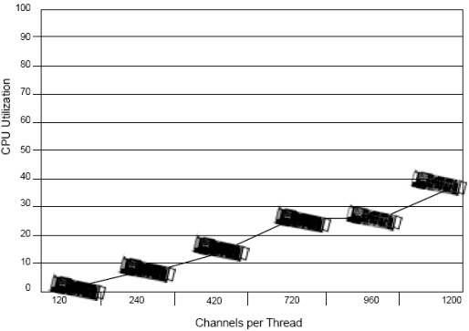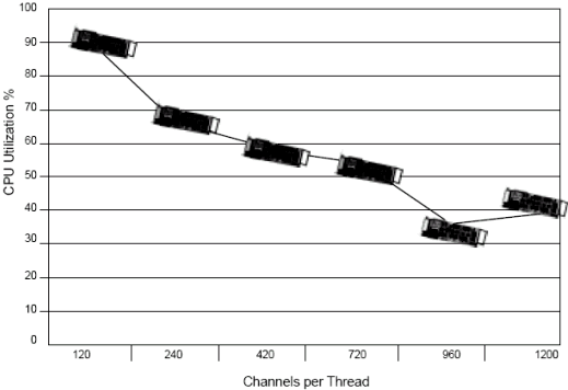 基于1200通道, Dialogic工程師測(cè)試了每個(gè)線程不同的通道數(shù)(例如每個(gè)線程120端口和240端口). 測(cè)試結(jié)果表明,