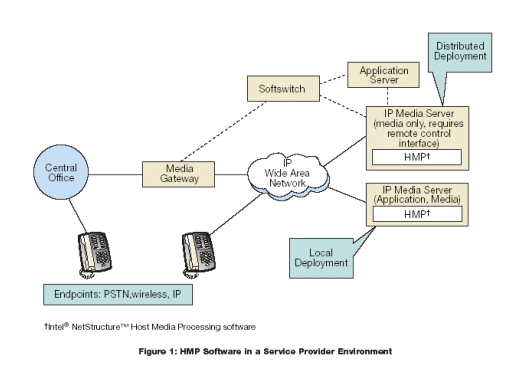 圖1表示使用HMP軟件的IP媒體服務(wù)器,部署在典型的服務(wù)提供商環(huán)境的例子,包括IVR,通告,語音郵箱/消息,語音識別和會(huì)議服務(wù)器。