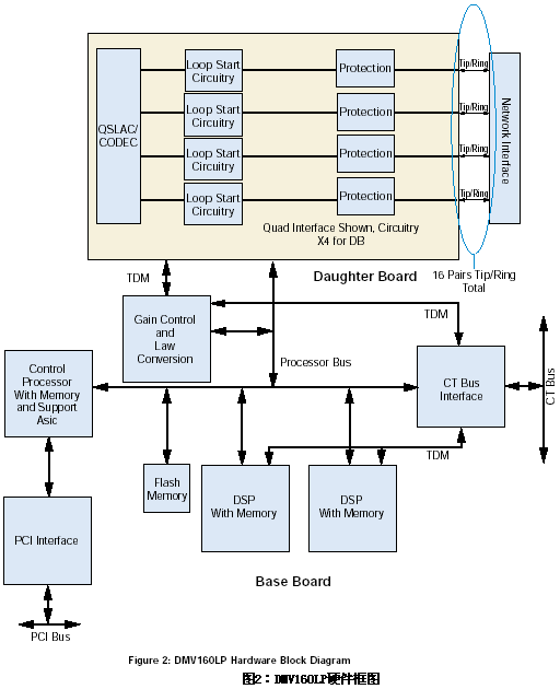 從連接到DMV160LP板卡的16條環(huán)路電話線上來的信號(hào)首先要通過電話線接口,該接口可以提供對瞬間電流的保護(hù)以及對電磁干擾的抑制。這些電話線接口使用了可靠的晶體開關(guān)(沒有機(jī)械連接)和FCC-Part