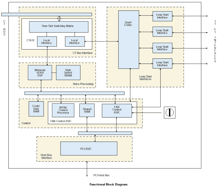 使用VFX/41JCT-LS板卡和CT總線時(shí),來自網(wǎng)絡(luò)板卡或其他資源的數(shù)字語音和資源通過H.100接頭和CT總線接口進(jìn)入板卡。由一個CT612芯片管理這些信號,并且作為通道協(xié)調(diào)器和矩陣交換機(jī)來緩存來自總線的高速信號數(shù)據(jù),直到每個通道的數(shù)據(jù)發(fā)送到DSP。